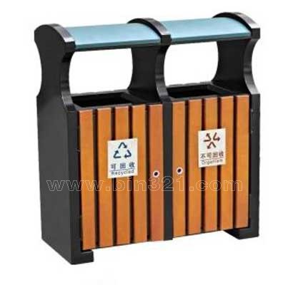 型号:A2333 规格:L800*W360*H900mm 材质:钢木分类垃圾桶。垃圾桶采用钢架结构,表面经过酸洗、去锈、然后采用户外粉末静电喷涂处理。桶身为实木条装饰,表面采用户外聚酯漆或户外水封漆上色涂装。垃圾桶内胆采用镀锌板材质。