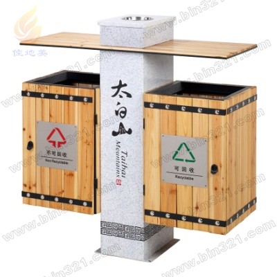材质:钢木分类垃圾桶。垃圾桶采用不锈钢立柱,桶身为实木条装饰,木条表面采用户外聚酯漆或户外水封漆上色涂装。垃圾桶内胆采用镀锌板材质。