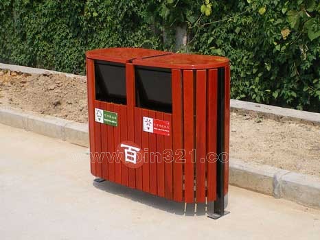 材质:钢木分类垃圾桶。垃圾桶采用钢架结构,表面经过酸洗、去锈、然后采用户外粉末静电喷涂处理。桶身为马来西亚进口山樟木条装饰,表面采用户外聚酯漆或户外水封漆上色涂装。垃圾桶内胆采用镀锌板材质。