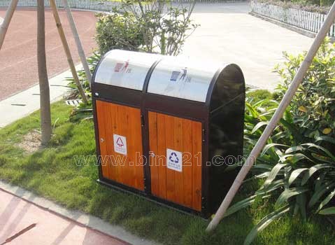 材质:钢木分类垃圾桶。垃圾桶采用钢架结构,表面经过酸洗、去锈、然后采用户外粉末静电喷涂处理。桶身为实木木条装饰,表面采用户外聚酯漆或户外水封漆上色涂装。不锈钢上盖,镀锌板内胆。