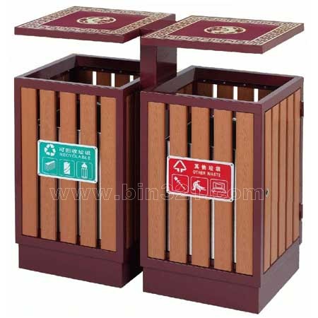 材质:钢木分类垃圾桶。垃圾桶采用钢架结构,表面经过酸洗、去锈、然后采用户外粉末静电喷涂处理。桶身为环保塑木条装饰,内胆采用镀锌板材质。