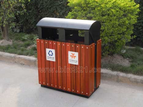 型号:A2302 规格:L800*W400*H980mm 材质:钢木分类垃圾桶。垃圾桶采用钢架结构,表面经过酸洗、去锈、然后采用户外粉末静电喷涂处理。桶身为马来西亚进口山樟木条装饰,表面采用户外聚酯漆或户外水封漆上色涂装。垃圾桶内胆采用镀锌板材质。