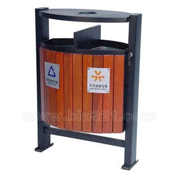 材质:钢木垃圾桶。垃圾桶采用钢架结构,表面经过酸洗、去锈、然后采用户外粉末静电喷涂处理。桶身为马来西亚进口山樟木条装饰,表面采用户外聚酯漆或户外水封漆上色涂装。垃圾桶内胆采用镀锌板材质。