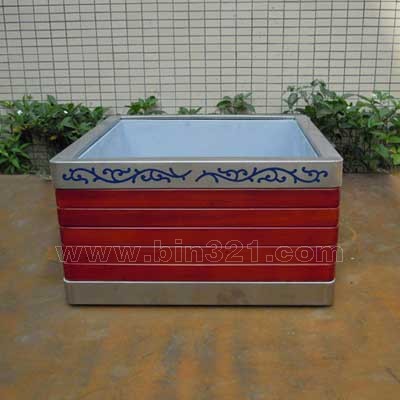 材质:垃圾箱采用优质不锈钢架结构,桶身为马来西亚进口山樟木条装饰,表面采用户外聚酯漆或户外水封漆上色涂装。花箱内胆采用镀锌板材质。