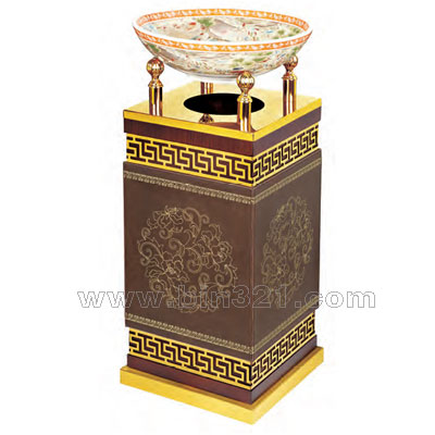 材质:黄色金属部份为优质不锈钢镀钛,桶身为皮纹饰面,镀锌版内胆。外观精美,高档。适用于酒店、大堂、等室内使用。